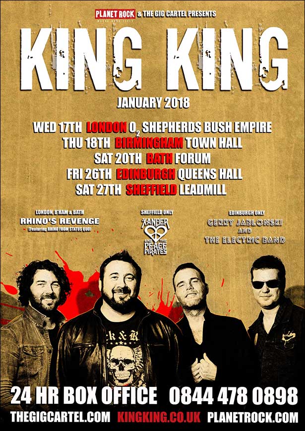 King King are pleased to announce the special guests for their January 2018 UK Tour. The award-winning rock blues band will be supported by Rhino’s Revenge (feat. Rhino from Status Quo) at the London Shepherd’s Bush Empire on Wednesday 17th January, the Birmingham Town Hall on Thursday 18th January and the Bath Forum on Saturday 20th January. Gerry Jablonski And The Electric Band will support King King at the Edinburgh Queen’s Hall on Friday 26th January and Xander And The Peace Pirates at the Sheffield Leadmill on Saturday 27th January.